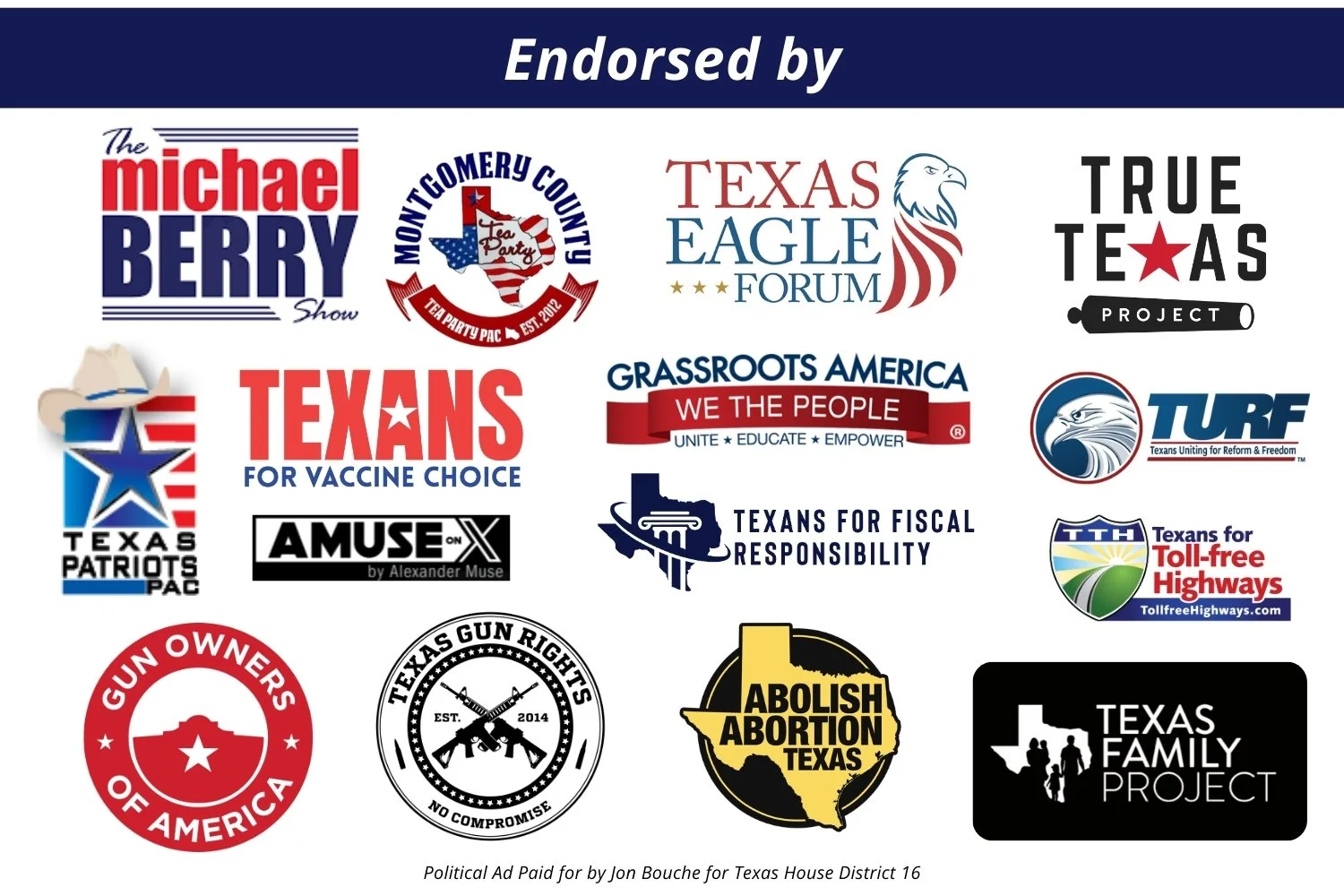 Jon will fight to uphold the conservative principles that Montgomery County citizens expect from their representatives. We can trust Jon to fight for our Christian Conservative values—because they are his values, too.