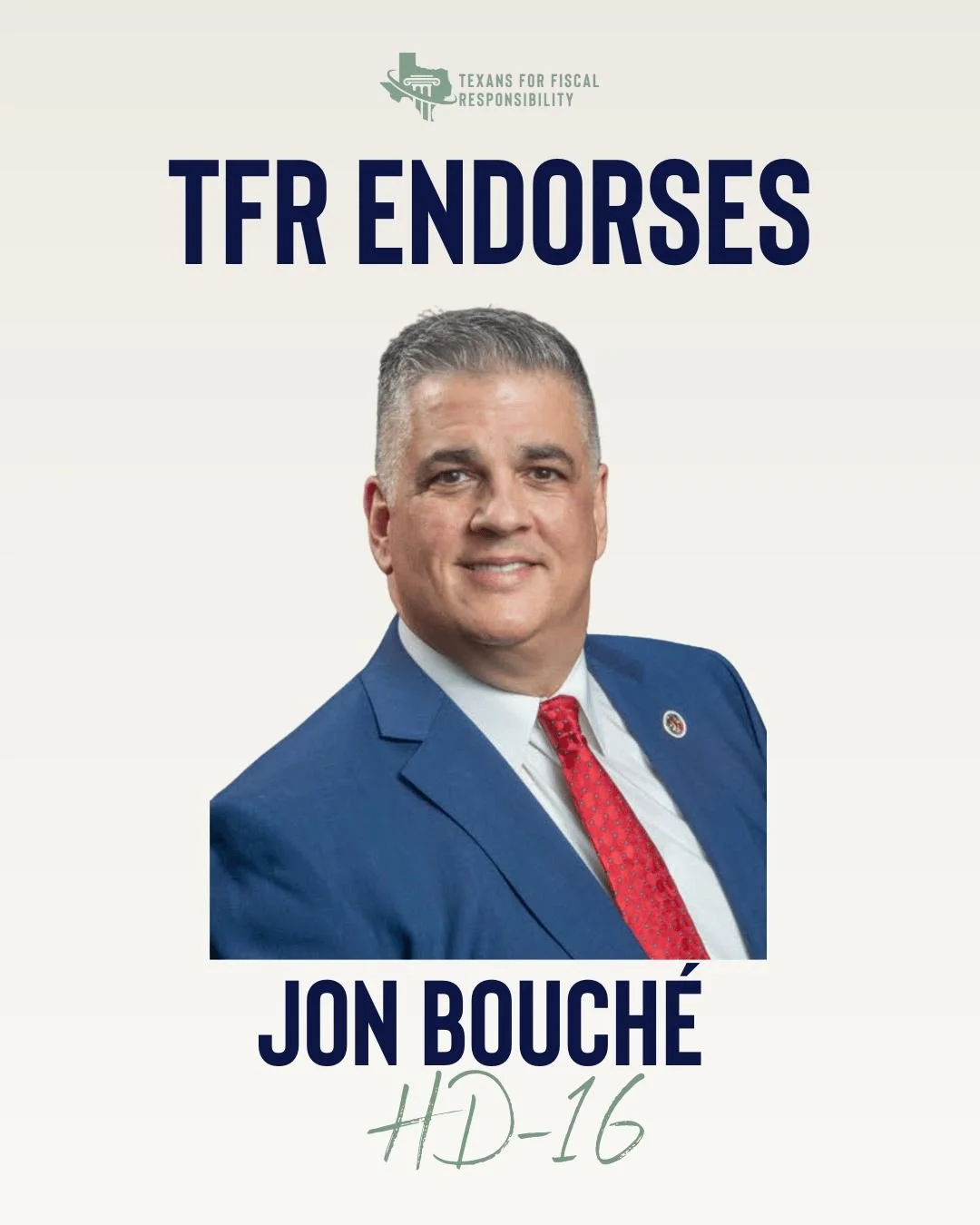 Taxpayers need a champion in Austin, and that's why Texans for Fiscal Responsibility (TFR) is endorsing Jon Bouché in the race for Texas House District 16.